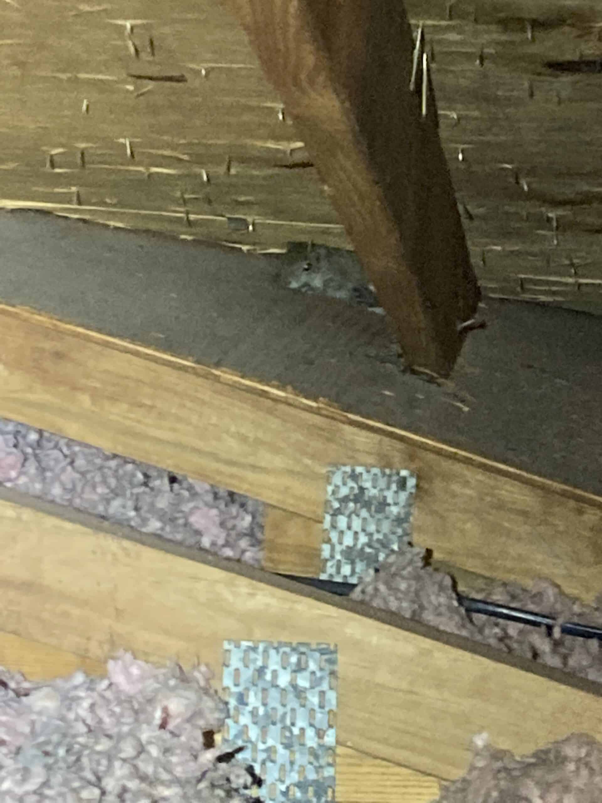 - Droppings or urine smells around attic corners, beams, or insulation layers